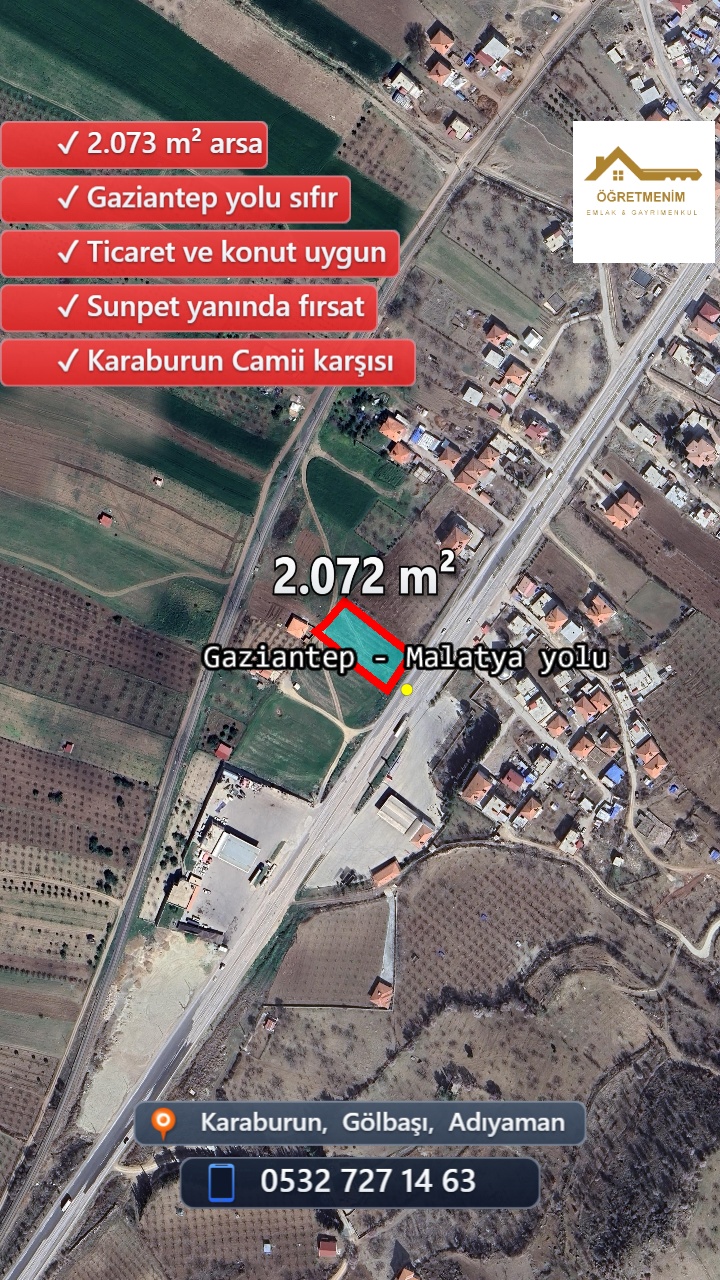 Adıyaman Gölbaşı Karaburun Köyü'nde, Balkar Beldesi tarafında yer alan bu fırsat arazimiz, 2172 metrekare genişliğinde olup Gaziantep Kahramanmaraş yoluna sıfır konumda bulunmaktadır. Ticari işletmelere ve huzurlu yaşam alanı arayanlar için müstakil daire yapımına uygun olan bu arsa, Sunpet'in yanında ve Karaburun Camii karşısında yer alıyor.