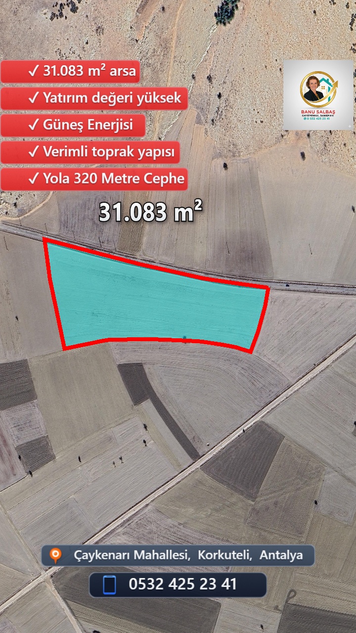 Antalya Korkuteli'nin yükselen değeri Çaykenarı'nda, 31 dönümlük müstakil tapulu tarla, yatırımcılar için kaçırılmayacak bir fırsat sunuyor. Bölgenin yüksek güneşlenme süresi, Güneş Enerjisi Santrali projelerine yüksek verimlilik potansiyeli sağlarken, yayla meyveciliği ve endüstriyel tarım için de ideal bir ortam sunmaktadır. Bölge rayicinin avantajıyla, bugünün en kârlı metrekare maliyetini 31 dönümlük bu devasa parselde yakalayın. Tek tapu, tam kapasite, maksimum verim.