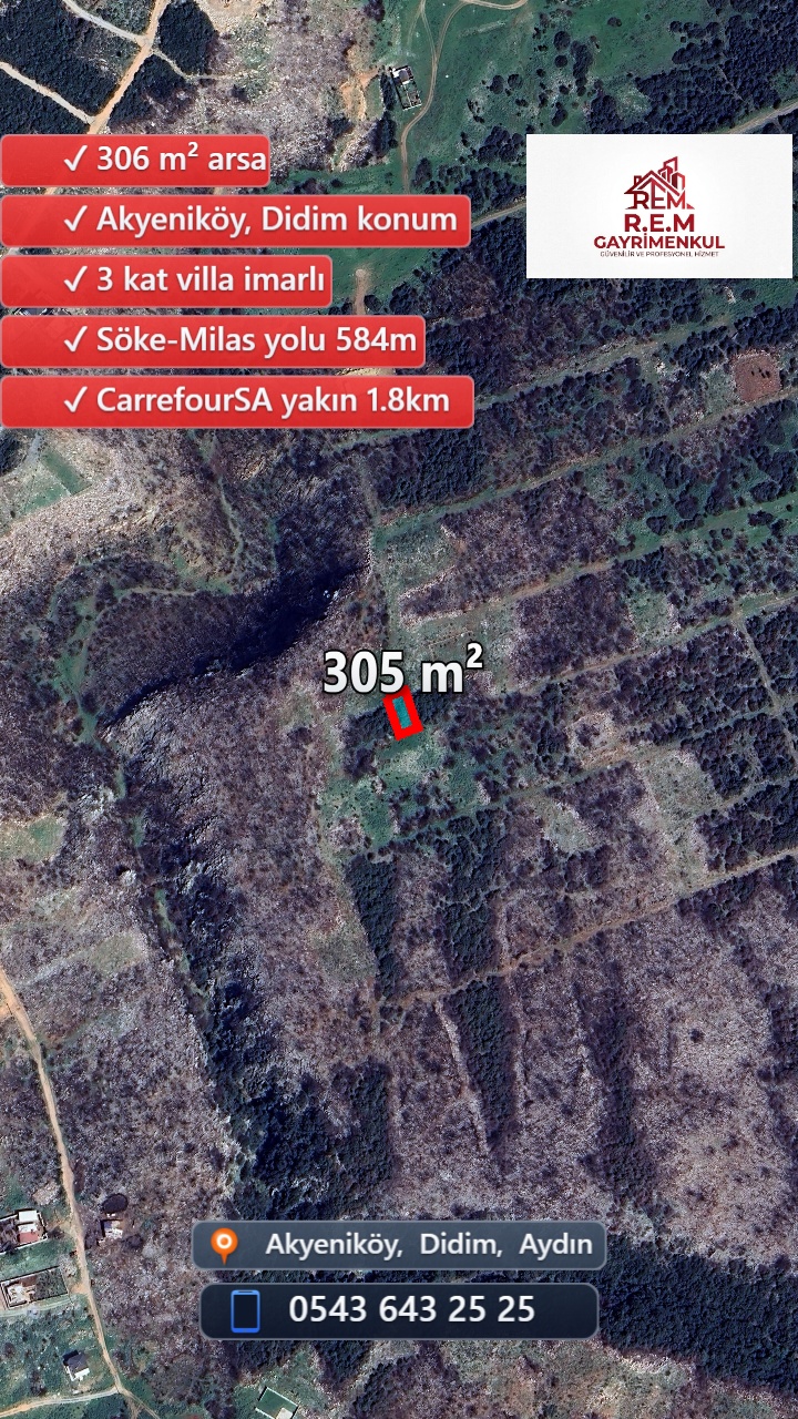 Aydın'ın gözde ilçesi Didim'de, Akyeniköy'de yer alan bu muhteşem arsa, 3 kat villa imarlı yapısıyla hayalinizdeki evi inşa etmeniz için ideal bir fırsat sunuyor. Doğayla iç içe bir yaşam arayanlar için kaçırılmayacak bir yatırım imkanı!