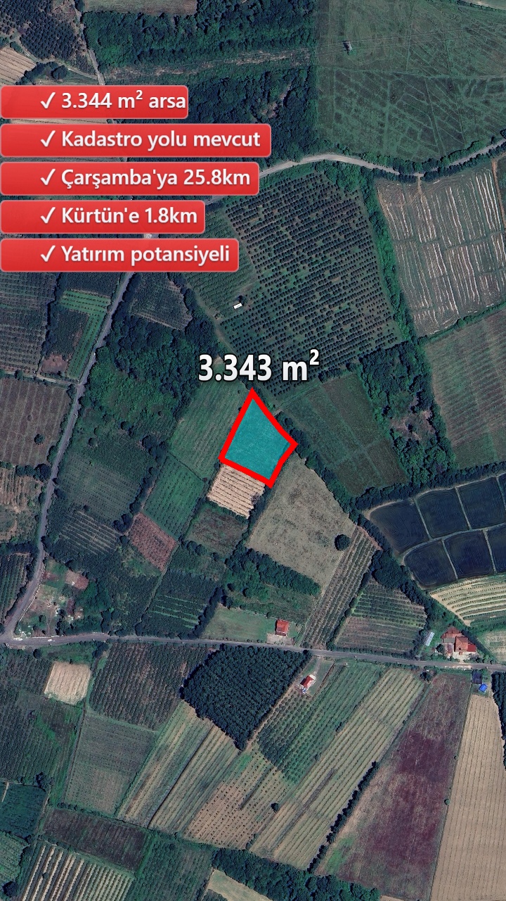 Samsun'un doğal güzellikleriyle ünlü Çarşamba ilçesi Kürtün mevkiinde, 3343 m2'lik eşsiz bir emlak fırsatı sizleri bekliyor. Kadastro yolu bulunan bu geniş arazi, yatırımcılar ve hayalindeki yaşam alanını inşa etmek isteyenler için ideal bir seçenek sunuyor.
