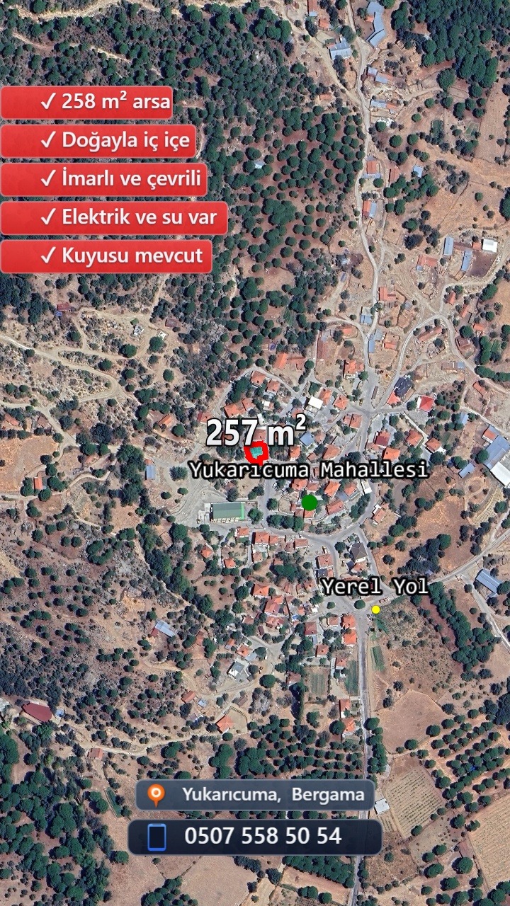 Yukarıcuma'nın huzur dolu köy yaşamını deneyimlemek isteyenler için ideal bir arsa! Bergama'nın doğal güzellikleriyle çevrili bu imarlı arsa, taş duvar ve tel çit ile çevrilidir. Elektrik aboneliği, şebeke suyu ve ayrıca kuyu suyu gibi altyapı olanaklarına sahiptir.